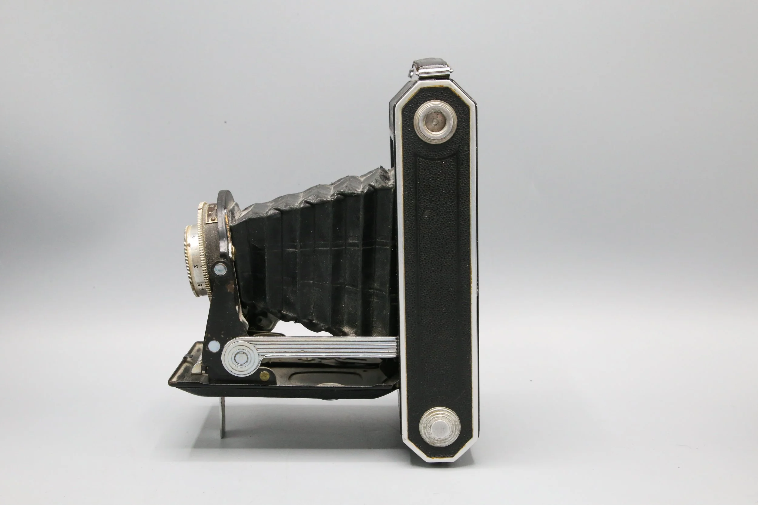 (1949-1961) After World War II, Kodak had two key factories in France—Sevran (film development) and Vincennes (film manufacturing). As post-war import restrictions made foreign cameras harder to obtain, Kodak began producing cameras locally. They based production on existing American or British models, including four main series: the 127 Star line, the Pony (entry-level 135), the Retinette (higher-end 135), and 620 format folding cameras. Some models, like the Brownie Flash, were adaptations of American designs. The 620 folding cameras went through four versions, evolving in design details like hood placement and scissor mechanism orientation. By the last version, simplifications were made, signaling the decline of folding cameras as Kodak shifted investment elsewhere.