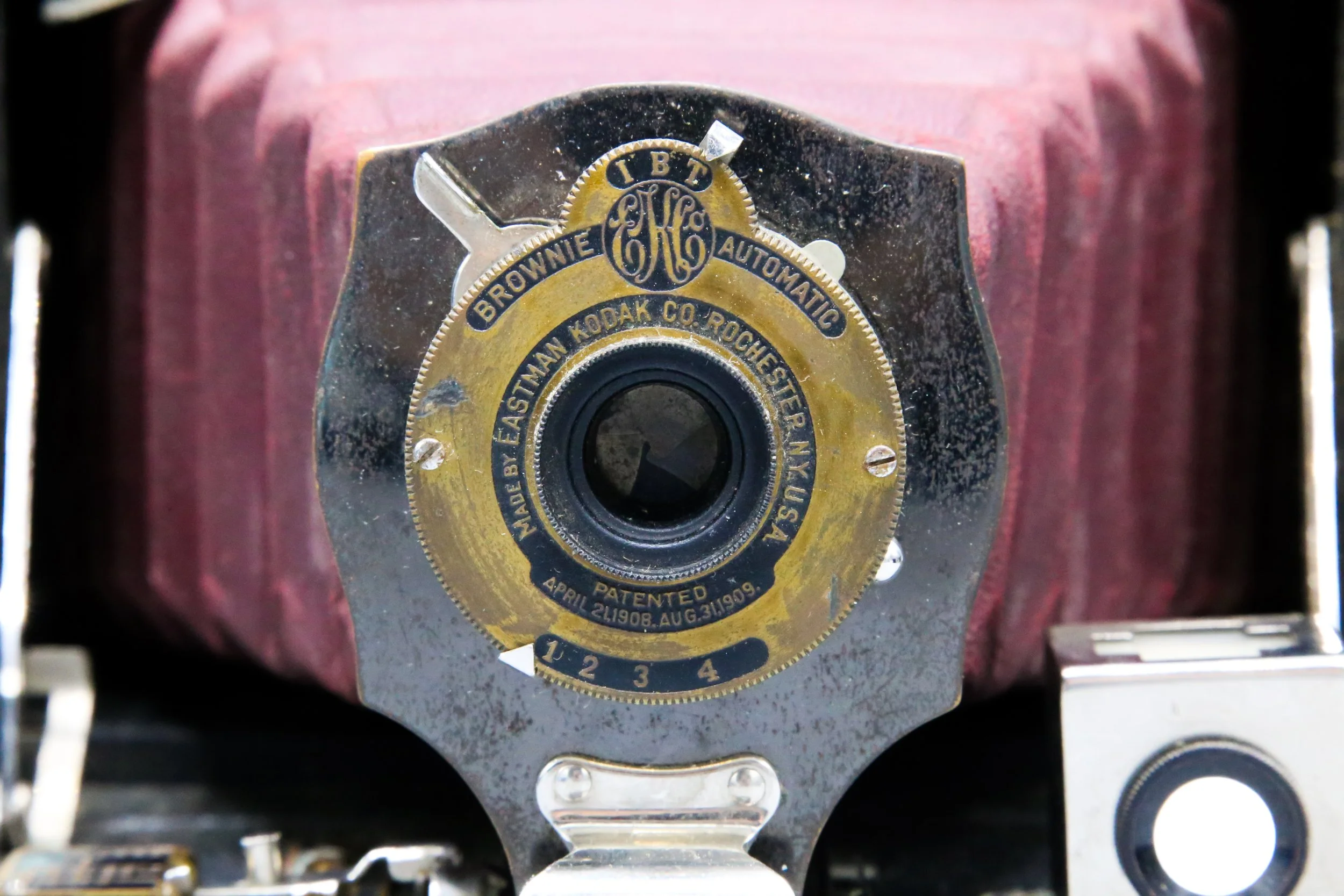 (1910-1915) The Kodak No. 2A Folding Pocket Brownie, launched in 1910, is a viewfinder folding camera that uses type 116 film. It features a meniscus achromatic lens, a Brownie Automatic shutter with I, B, and T modes, and a basic aperture scale (1–4). Focus is adjustable via bellows for distances of 8, 25, or 100 feet. It includes a reflecting-type viewfinder.